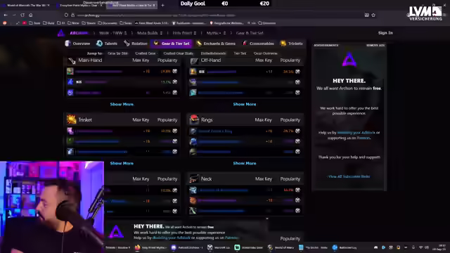01:24:41Es wird über die aktuelle Ausrüstung gesprochen und ob bestimmte Items verbessert werden sollten. Dabei wird erwähnt, dass ein bestimmter Gürtel noch nicht die beste Wahl ist und man bis zum nächsten Patch warten sollte, um bessere Alternativen zu finden. Es wird auch die neue Seite von Jotz erwähnt, die Statistiken von Raider.io für eine bessere Übersicht bieten soll, aber noch nicht so gut wie Archon ist. Der Streamer plant, seinen Umhang zu simulieren, um die besten Verzauberungen zu finden, einschließlich Static Charge und Eventual Electric Grint. Es werden verschiedene Optionen für Umhänge durchgespielt, um die optimale Konfiguration zu ermitteln. Zudem wird überlegt, welche Bosse im aktuellen Content machbar sind, wobei die Entscheidung von möglichen Sub-Boni abhängt. Es wird auch erwähnt, dass es einen Fix gab, der für 12er Keys etwas mehr Score bringt. Abschließend wird über das Simmen von Trinkets gesprochen, um mögliche Diskrepanzen zu erkennen und die beste Wahl zu treffen.
