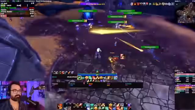 05:21:08Der Streamer kommentiert laute Bosskämpfe und gibt Hinweise zur Orientierung im Kampf. Es werden spezifische Mechaniken der Bosse besprochen, wie das Kiten von bestimmten Mobs und das Interrupten von Fähigkeiten. Der Streamer erklärt die Bedeutung von Positionierung und Timing in den Kämpfen. Er gibt konkrete Anweisungen für verschiedene Gruppen und Rollen, insbesondere für Tanks und Heiler. Es werden Probleme mit der Internetverbindung erwähnt, die den Stream beeinträchtigen.