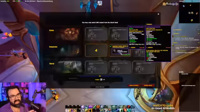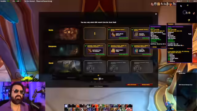 06:39:45Nach Öffnung eines Vaults mit einem Ring trinkt der Streamer dreimal, da das Item als minderwertig eingestuft wurde. Es folgen weitere Diskussionen über Item-Upgrades und Loot-Entscheidungen. Die Gruppe schlägt vor, einen Heiler oder Tank für den nächsten Key zu wählen, woraufhin der Streamer für die Evoker-Healer-Klasse wirbt und eine neue Abstimmung initiiert.
