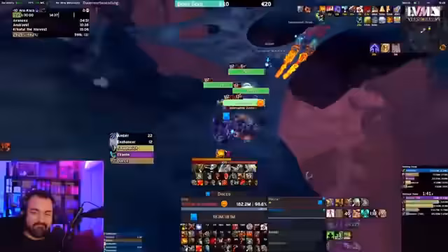 06:02:55In Phase 2 des Dimensius-Kampfes ändert sich der Fokus. Der Raid sammelt sich weiterhin bei den Ads, während neue Flächen und Kreissektoren an den Rand platziert werden. Die Kommunikation zwischen den Playern ist entscheidend, um den Boss nicht durch Knockbacks in die Raidmitte zu ziehen. Der Streamer gibt präzise Anweisungen zur Bewegung und zur Zielauswahl während der Kampfmechaniken weiterlaufen.