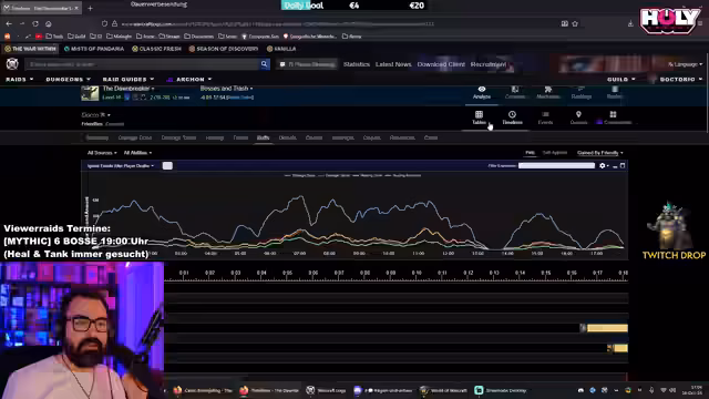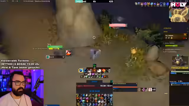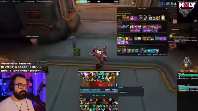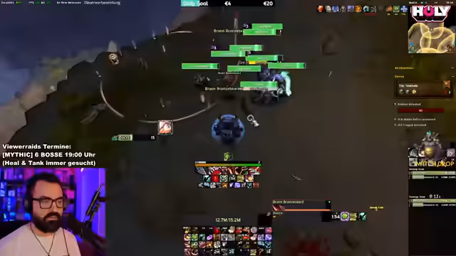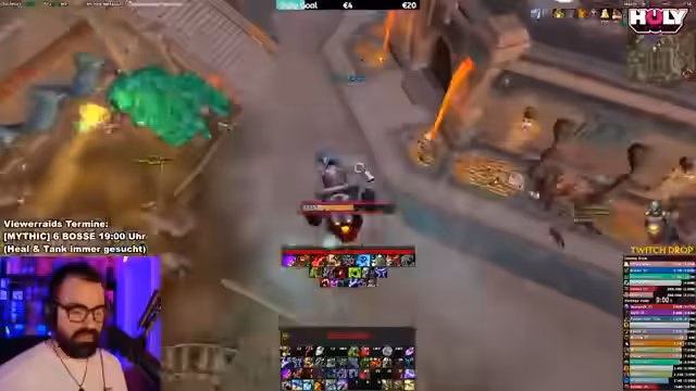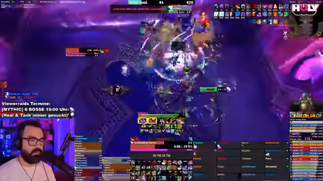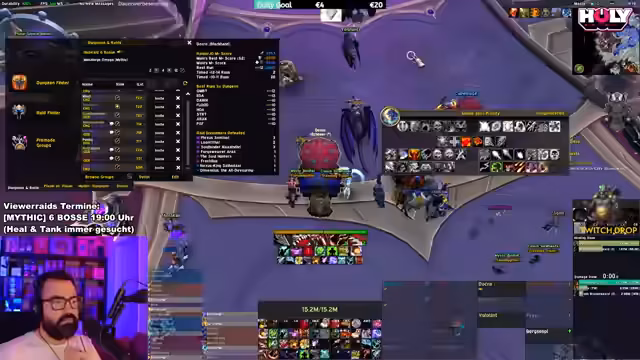03:16:15Die Suche nach einer vollständigen Raid-Gruppe gestaltet sich schwierig, insbesondere was den fehlenden Warlock betrifft. Der Streamer betont die Wichtigkeit eines Warlocks für den Raid und ist ungeduldig mit dem Warten auf fehlende Klassen. Währenddessen werden Abonnements und Spenden im Chat gefordert und ein Ausweich-Charakter für den Hunter erwähnt. Auch technische Probleme mit Addons wie M+ Timer werden angesprochen.