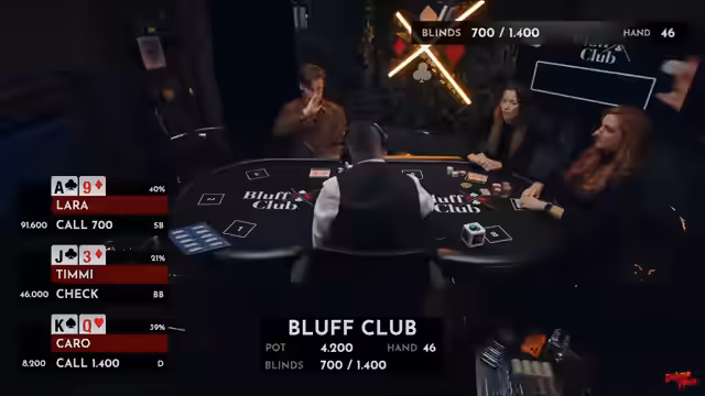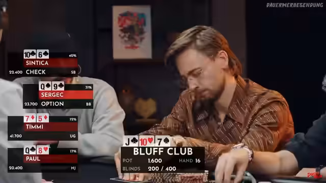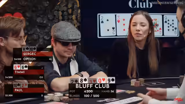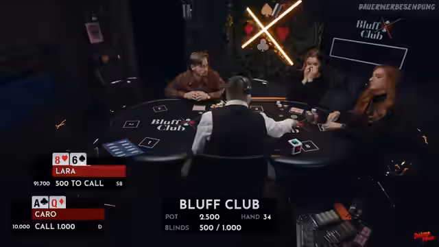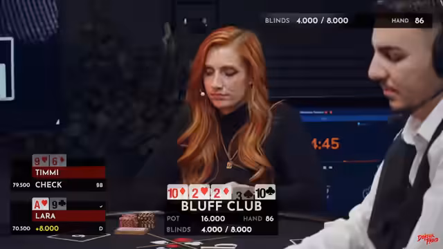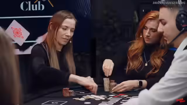 02:09:47Die Pokerpartie erreicht einen spannenden Punkt, als Timmy mit einem Pärchen Vierer eine hohe Gewinnchance von 74% hat, da die Community-Cards keine Treffer für die anderen Spieler zeigen. Dies verdeutlicht, wie oft am Pokertisch auch vermeintlich schwache Hände überraschend gewinnen können. Lara zeigt sich als erfahrene Spielerin, die ihre Züge gut durchdenkt. Die Atmosphäre am Tisch wird zunehmend ernster, insbesondere da die Blinds mit 600.200 sehr hoch sind. Caro, die auf dem Dealer-Button sitzt, hat Glück, da sie den Big Blind nicht setzen muss und so eine kostenlose Runde erhält, um ihre Karten zu prüfen. Sie entscheidet sich jedoch, ihre König 6 wegzulegen, um höhere Kosten zu vermeiden. Timmy und Lara spielen weiterhin strategisch, wobei Timmy mit Bube 7 und Lara mit Ass Dame suited gute Starthände haben. Ein unerwarteter Flop mit zwei Neunern hätte Caro eine starke Hand beschert, doch sie hatte ihre Karten bereits abgelegt, was ihren Ärger hervorruft. Timmy trifft später eine Sieben, wodurch er ein Pärchen Siebener erhält, was ihn in eine vorteilhafte Position bringt. Lara muss nun auf eine Acht oder einen König hoffen, um zu gewinnen, was ihre Chancen auf 12 Prozent reduziert. Die Spannung steigt, da Caro mit nur noch wenigen Big Blinds unter Druck steht und eine kritische Phase im Spiel erreicht.