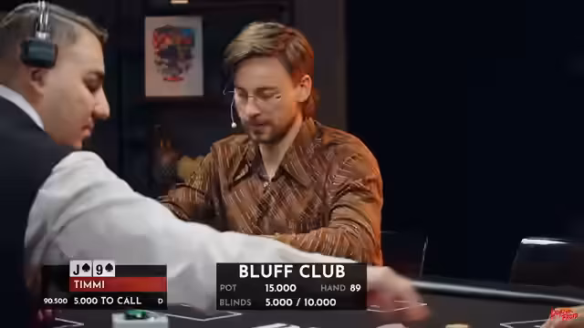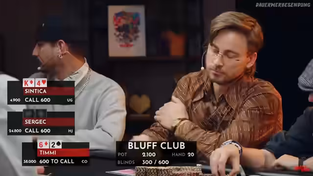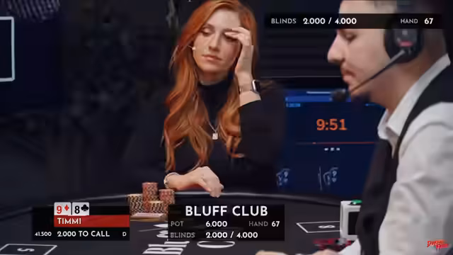 00:32:22Als erster Gast wird Timmy Trinks, ein bekannter Schauspieler und „Fellow-Wohnwagenkind“, herzlich begrüßt. Er erhält wie alle Spieler 25.000 Chips als Startkapital. Timmy gibt zu, seit zwölf Jahren nicht mehr gepokert zu haben, sieht dies aber als Vorteil, um seine Mitspieler zu überraschen. Im Falle eines Sieges würde er die 2500 Euro an „Jumen e.V.“ spenden, eine Organisation, die sich für die Beseitigung von Gewalt gegen Frauen einsetzt und Femizide verhindern möchte. Anschließend wird Caroline von der Gröben, Reporterin und bekannt durch das Y-Kollektiv, vorgestellt. Ihre Poker-Erfahrung ist ähnlich gering wie die von Timmy, was jedoch dem lockeren Charakter des Bluff Clubs entgegenkommt. Sie möchte ihren Gewinn der Forschung von ME-CFS spenden, einer Krankheit, die oft nach Corona auftritt und das Leben junger Menschen stark beeinträchtigen kann. Beide Spieler wählen ihre Plätze am Tisch und erhalten ihr Startkapital.