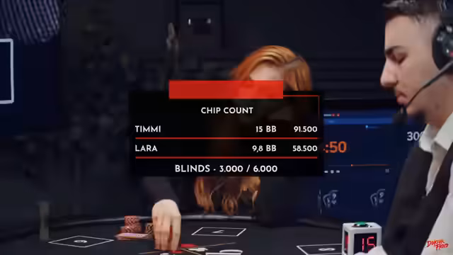 03:09:48Nach einer kurzen Pause kehren die Moderatoren zum Pokertisch zurück, wo Caro leider ausgeschieden ist und das Spiel in ein Heads-Up zwischen Lara und Timmy übergeht. Die Blinds sind bei 700/1400. Timmy gewinnt eine Hand mit einem Drilling, während Lara mit einer "Oma-Hand" ein Full House bildet. Die Moderatoren analysieren die Spielweise der Teilnehmer, insbesondere Laras Pokerface und ihre Fähigkeit, auch mit scheinbar schwachen Händen zu gewinnen. Es wird betont, dass unerfahrene Spieler schwer zu lesen sind. Die Spannung steigt, da beide Spieler relativ dicht beieinander liegen, was das Heads-Up besonders interessant macht. Die Bedeutung von Chip-Counts im Heads-Up wird erklärt, da ein großer Vorsprung es einem Spieler ermöglicht, den Gegner durch aggressives Spiel unter Druck zu setzen. Die Karten werden analysiert, und es wird festgestellt, dass sich die Wertigkeit der Starthände ändert, je weniger Spieler am Tisch sind. Die Diskussion endet mit der Ankündigung, Caro für ein kurzes Gespräch hinzuzuholen.