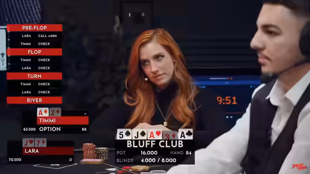05:08:07Nachdem Lara einige Chips zurückgewinnen konnte, wird die Idee geboren, die beiden Finalisten für kurze Interviews ans Mikrofon zu holen, um ihre Gefühle während des Spiels zu erfahren. Die spontane Umsetzung mit einer mobilen Kamera wird gelobt. Während der Interviews betonen die Spieler ihre Aufregung und Konzentration. Lara äußert sich über ihre schlechten Karten und die dadurch entstehende Nervosität sowie Magenschmerzen. Es wird festgestellt, dass bereits über 100 Hände gespielt wurden. Die Kommentatoren versuchen, neutral zu bleiben und keine Tipps zu geben. Es wird ein Comeback von Lara prognostiziert. Der Dealer wird kurzzeitig heruntergeregelt, da seine Kommentare im Stream zu hören waren.
