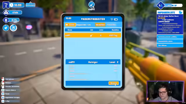 06:04:55Der Stream wechselt das Spiel und startet in einen Wasserpark. Zuerst gibt es technische Hürden, die jedoch schnell behoben werden. Eine Neuerung ist die Anzeige der aktuellen Zeit im Spiel. Nachdem das Spielfeld aufgeräumt ist, beginnt das Gameplay mit dem Verwalten eines Wasserparks, einschließlich Einstellen von Mitarbeitern und Bedienung von Ständen.