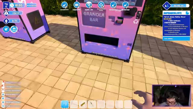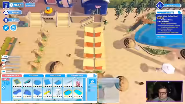 06:06:16Der Streamer beginnt die Wasserpark-Simulation und stellt fest, dass es ein Update für das Spiel gibt. Die Mission ist es, den Action Park auf Level 5 zu bringen. Dafür werden neue Mitarbeiter eingestellt, darunter Putzkräfte, um den Park sauber zu halten. Es wird humorvoll über die Effizienz und Präzision der Mitarbeiter gesprochen. Der Streamer kümmert sich persönlich um die Kasse und die Essensstände, um den Park am Laufen zu halten. Es kommt zu lustigen Situationen, wie Gäste, die in den Pool pinkeln oder ausrutschen, und der Streamer muss als Bademeister und Verkäufer gleichzeitig agieren. Die Ticketpreise sollen erhöht werden, um mehr Geld zu verdienen und Upgrades freizuschalten.