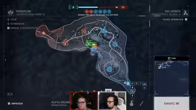10:06:53Nachdem Dennis sein Battlefield-Spiel beendet hat, wechselt das Team zurück ins Studio und startet mit Battlefield. Der Streamer entscheidet sich, die Eroberungs-Karte zu spielen, nachdem er zuvor Eskalation und Durchbruch ausprobiert hat. Die Zielsetzung ist, Punkte für das Team zu sammeln und die feindlichen Ziele einzunehmen.