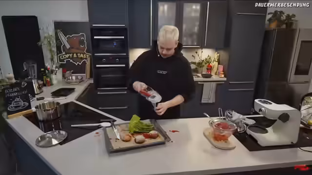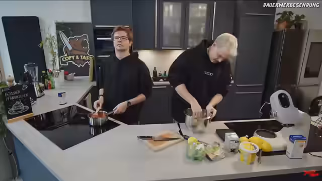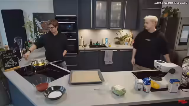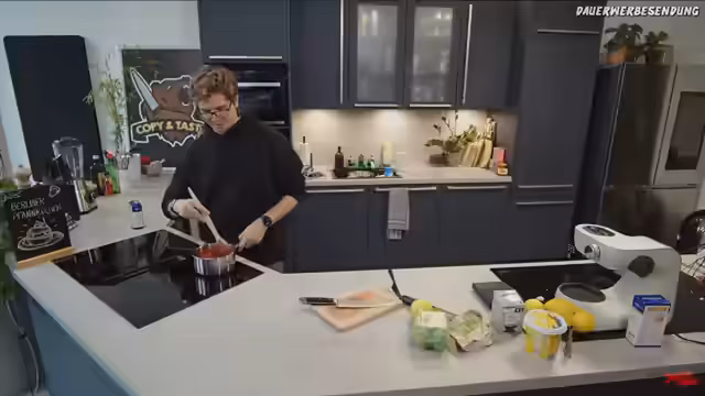02:36:37Während der Teig an einem warmen Ort gehen muss, bereitet der Streamer parallel die Erdbeerfüllung vor. Er schnittelt frische Erdbeeren sehr klein und gibt sie in einen Topf, wo sie mit Gelierzucker und etwas Zitronensaut langsam köcheln, um die Flüssigkeit entziehen zu können. Anschließend wird die Masse mit einem Stabmixer püriert und mit einer zusätzlichen halben Portion Himbeermarmelade aufgestockt, um den Geschmack zu intensivieren und eine dickere Konsistenz zu erzeugen.