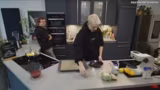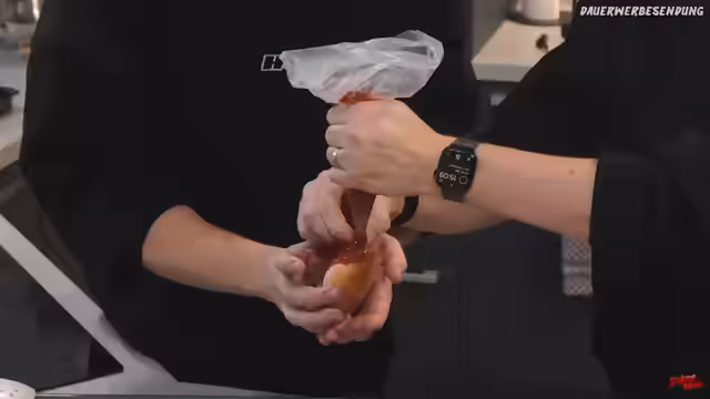 04:41:04Die gebackenen Berliner werden aus dem Fett genommen und abgetropft. Nun folgt die anspruchsvolle Aufgabe, sie mit einer selbstgemachten Erdbeermarmelade zu füllen. Ein Profispritzen wird verwendet, aber es treten schnell Probleme auf: Verstopfungen durch Stücke der Erdbeeren oder der Teig machen den Prozess mühsam. Trotz Schwierigkeiten und einer Küche, die nach dem Füllen aussieht wie ein Schlachtfeld, werden die Berliner erfolgreich gefüllt und anschließend im Zucker gewälzt. Die finalen Berliner werden als lecker und weniger fettig als erwartet bewertet.