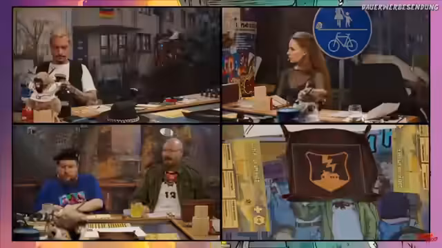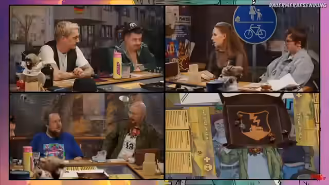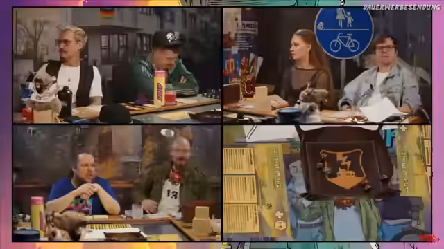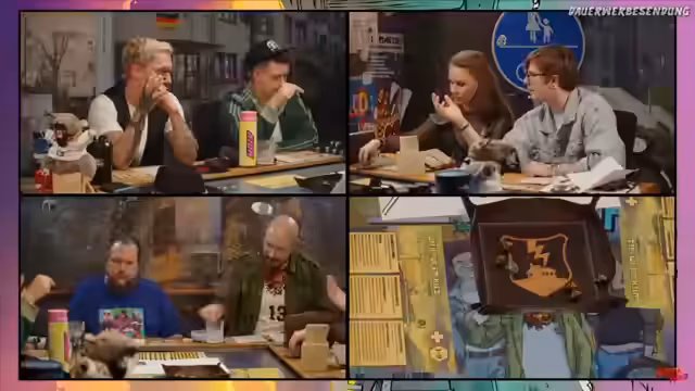 00:23:54Das Rollenspiel 'Krawall im Kiez' ist in den 90er-Jahren angesiedelt und spielt in Berlin. Die Clique hat sich bereits mit Nazis und holländischen Drogendealern angelegt. Aktuell sind sie im Begriff, Drogenpakete für den Holländer Floris auszuliefern. Die Zusammenfassung der letzten Folgen offenbart, dass die Gruppe aus Borg, Peder, Kevin, Schulz und Mona besteht, die nach einer gemeinsamen Nacht ihre Aufgaben für den Tag antreten. Während Mona die VHS-Kassetten tauschen soll, plant der Rest die Lieferung durch die Stadt.