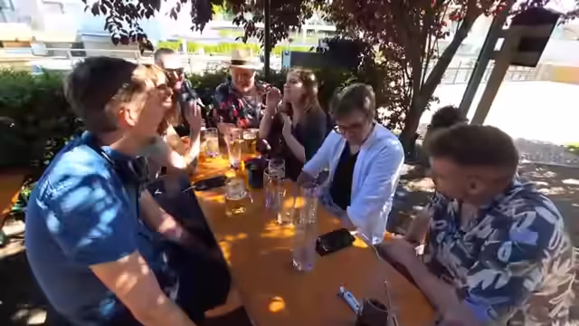00:05:29Die Gruppe, bestehend aus Lena, Dennis, Yuga, Paul, Olli, Corinna und Marius, sitzt gemütlich zusammen. Sie diskutieren über die beste Platzierung für die Mikrofone, um eine gute Audioqualität für den Stream zu sichern. Nach anfänglichem Chaos werden die Mikrofone auf Hemden oder Tischen abgelegt. Anschließend stellen sich die Anwesenden vor und unterhalten sich lockeres über verschiedene Themen.