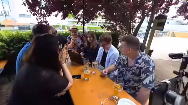 00:43:38Die Streamer überlegen sich einen einheitlichen Auftritt und eine plausible Cover-Story für Passanten, die sie bei ihrer Pressekonferenz-ähnlichen Aufstellung im Biergarten fragen, was sie tun. Sie einigen sich auf eine humorvolle Antwort, wie zum Beispiel 'Bündnis der Fußboden-InspektorInnen'. Der Spaß steht im Vordergrund, um das Event unterhaltsam für die Zuschauer zu gestalten.