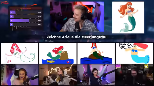 01:24:44Als nächstes Zeichenmotiv wird Ariel die Meerjungfrau gewählt. Der Streamer diskutiert, welche Version von Ariel – vor der Disney-Klassiker – gemeint ist und fasst kurz die Handlung des Films zusammen. Nach dem Voting, bei dem Lilli den ersten Platz belegt, wird die letzte Runde vor der Bonusrunde angekündigt: eine 'Ugly-Runde' mit den Teletubbies. Der Streamer beschreibt die Charaktere humorvoll und zeigt einige extrem kreative und 'hässliche' Versionen aus der Community, bevor die Punktwertung startet, die Feine Katze für den hässlichsten Entwurf für sich entscheidet.