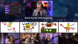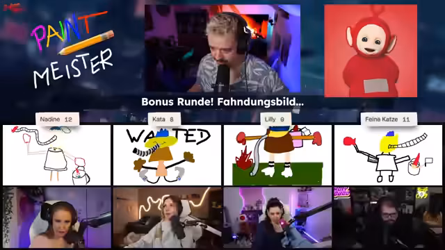 01:47:22Die finale Bonusrunde ist ein kreatives Rollenspiel. Alle Teilnehmer sind nun Kriminalpolizisten und müssen ein Fahndungsbild für einen fantasievollen Übeltäter mit dem Namen 'Gartengeräher' zeichnen. Der Streamer liefert eine absurde und detaillierte Beschreibung des Täters: er hat die Form eines umgedrehten Blumentopfs, Hühnerbeine mit Tennissocken, Zollstöcke als Arme, eine Zitrone als Kopf und trägt eine blaue Perücke. Das absurde Szenario regt die Kreativität der Community an, die gleichartig skurrile und amüsante Kunstwerke beisteuert.