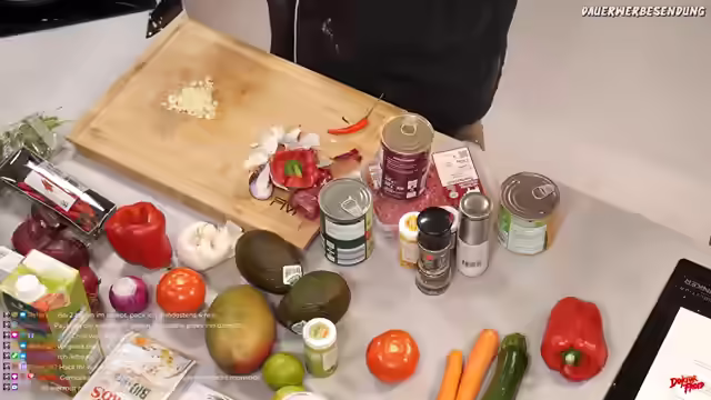 00:35:35Die Streamer beginnen, die vorhandenen Zutaten dem übersetzten Rezept zuzuordnen. Zu den Zutaten gehören unter anderem Apfelsaft, gehackte Tomaten, Kidneybohnen, Eisbergsalat, Weizenmehl, Chili, Karotten, Salz, Pfeffer, Avocado, Mango, Sour Cream, Zwiebeln, Limette, Knoblauch, Tomate, Paprika, Kreuzkümmel, Oregano, Mais, Backpulver, Olivenöl und Zucchini. Es wird spekuliert, dass 'Handvoll Dreck' Mehl sein könnte und 'vergessene Tränen' Salz. 'Zangen vom Aufstehstein' wird als Backpulver interpretiert und 'Blut aus der schüchternen Blume' als Olivenöl. 'Warme Wolken' wird als warmes Wasser gedeutet. Es wird diskutiert, ob es sich um eine Art Pizza oder Tartkuchen handeln könnte. Die Streamer analysieren die Zubereitungsanweisungen und versuchen, diese auf die Zutaten anzuwenden. Es wird festgestellt, dass Hefe fehlt, was die Zubereitung erschwert.