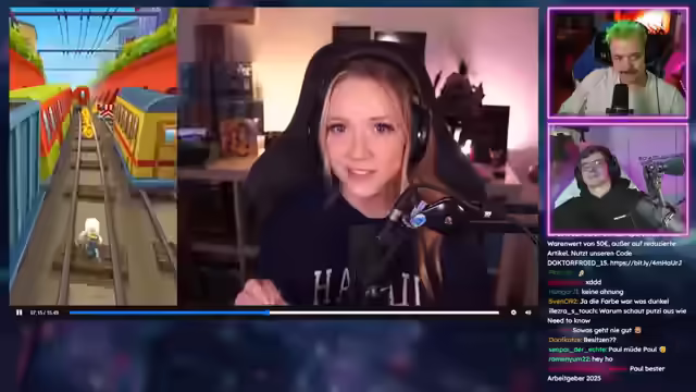01:18:22Es wird die Tram-Europameisterschaft thematisiert, die die Streamer vor dem Stream gesehen haben und nun selbst produzieren möchten, da die ursprüngliche Produktion als mangelhaft empfunden wurde. Die unglaubliche Unterstützung der Community während des Subathons wird hervorgehoben, insbesondere die Anzahl der Subs im Hype Train, die zu einem defekten Timer führte und die Streamer auf über 60 Stunden Streaming-Zeit brachte. Es wird humorvoll angemerkt, dass die Community Riot pleite machen könnte, wenn sie nur krass genug wäre. Es wird ein Clip gezeigt, in dem der Chat 'Happy Birthday' singt, was zu einem besonderen Geburtstagssong führte. Anna hat sich einen elektrischen Roller gekauft, nachdem sie Probleme mit dem alten hatte. Ein weiterer Clip zeigt Lara, die im Pool fotografiert wurde, und einen Moment, in dem sie sich verletzt hat. Es wird ein XXL-Burger-Test vorgeschlagen, bei dem alle Standard-Burger von McDonalds hintereinander getestet werden sollen. Ein witziger Moment, in dem Lara während eines Community-Spiels aus dem Ladescreen flog, aber ihr Team sie trotzdem mitnahm und gewann, wird ebenfalls gezeigt.