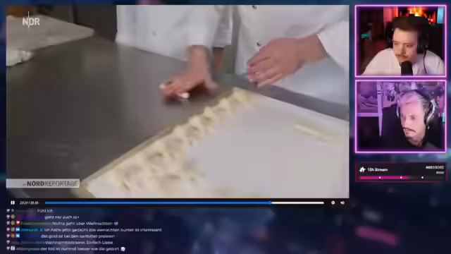 02:05:59Im Stream wird der Baumkuchen als die höchste Kategorie und das Wahrzeichen der Konditoren erklärt. Der Streamer erläutert die komple Herstellung, bei der die Schicht für Schicht auf einem spießähnlichen Gerät gebacken werden. Eine Apparatur mit langer Erfahrungsschatz, bei der die Temperatur und Dicke entscheidend sind. Der kleine Baumkuchen hat sieben Schichten, der große bis zu zwölf. Jede Innung und jeder Verband führt den Baumkuchen in seinem Logo, was ihn zur Königsdisziplin in der Konditorei macht.