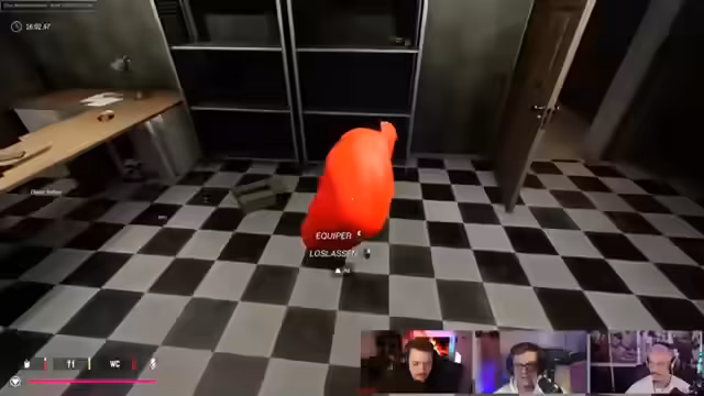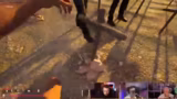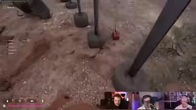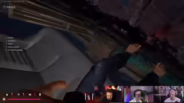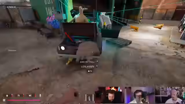 01:03:51Obwohl die Spieler erfolgreich auf das Dach gelangen, ist es schwierig, die dortigen Teile einzusammeln, da man sich nicht gut bewegen und festhalten kann. Der Konvoi fährt weiter und stößt auf ein großes Auto mit Tankstelle, in dem sich ein Motor befindet. Das Team beschließt, diesen zu holen, was jedoch aufwendig ist. Im Prozess des Herabholens werden Teile wie eine AK, ein Raketenwerfer und weiteres Inventar geworfen und müssen vom Teammitglied am Boden aufgefangen werden.