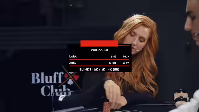 03:51:33Das Turnier erreicht sein Finale im Heads-Up zwischen Lara und Aria Adams. Die Dynamik komplettiert sich, da nur noch zwei Spieler am Tisch sitzen. Aria, die zurück ins Spiel gekommen ist, sieht sich mit einem geringen Chip-Rückstand konfrontiert und muss aggressiv spielen. Die Runden sind von Vorsicht geprägt, da jeder Fehlzug zur Niederlage führen kann. Die Spannung steigt, da beide Spieler um den Sieg und die 2.500 Euro für den guten Zweck kämpfen.