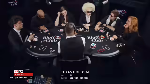 00:28:21Nachdem alle Spieler ihre Plätze bezogen haben, werden die beiden Poker-Expanten für den Abend vorgestellt: der Dealer "Marianne" und der Kommentator "Guess". Sie sorgen für einen regelkonformen Ablauf und erklären das Spiel den Zuschauern. Der Pokertisch ist professionell ausgestattet mit einem Scansystem, das die Karten automatisch erkennt und die Gewinnwahrscheinlichkeiten für jeden Spieler und jede Hand anzeigt. Eine "Shot Clock" von 30 Sekunden pro Zug und "Time Chips" für längere Überlegungen sollen das Spiel beschleunigen.