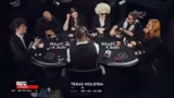 00:46:26Nach einer kurzen Erklärung der Turnierregeln, insbesondere des "Freeze-Out"-Formats, bei dem ausgeschiedene Spieler nicht zurückkehren können, beginnen die ersten Hände. Die Kommentatoren Guess und Dr. Freund geben im Hintergrund laufende Analysen zu den Händen, den Blinds und dem Chip-Stand. Sie erläutern Begriffe wie "Suited", "Straight Draw" und "Full House" und bewerten die Spielzüge der Teilnehmer, wobei sie besonders die Starthand von Paul (Pocket Aces) als die beste mögliche hervorheben.