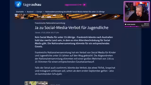 01:53:35Der Streamer berichtet über ein neues Gesetz in Frankreich, das Social-Media-Plattformen für Kinder und Jugendliche unter 15 Jahren verbieten könnte. Dieses Gesetz soll die mentale Gesundheit schützen und mit 130 zu 21 Stimmen bereits die Nationalversuch bestanden. Es wird eine Umfrage gestartet, in der die Mehrheit das Verbot befürwortet. Anschließend wird ein ähnliches Gesetz in den Niederlanden erwähnt, das Junkfood-Werbung für Kinder unter 13 Jahren verbietet. Der Streamer diskutiert die Wirksamkeit solcher Verbote und stellt die Frage, ob nicht mehr Aufklärung nötig wäre.