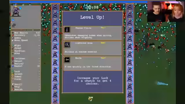 03:14:05Nach weiteren technischen Problemen, die zu einem Absturz des Spiels führen, wird Vampire Survivors komplett neu gestartet. Die Einstellungen werden auf Standard zurückgesetzt, um den Charakter 'Garlic' (Knoblauchmann) zu spielen. Der Fokus liegt nun darauf, ohne zusätzliche Buffs oder Upgrades für 30 Minuten zu überleben, während die beiden Spieler die Level-Ups teilen.
