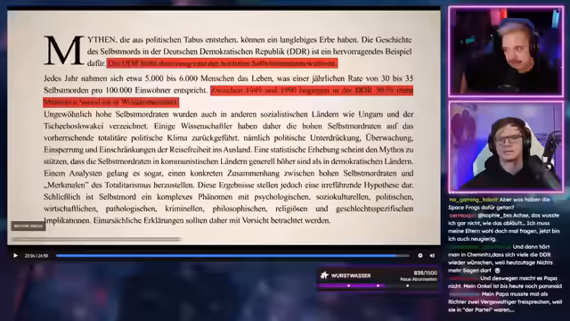 03:10:14Der Stream fasst die langfristigen psychischen Nachwirkungen der Stasi-Überwachung zusammen, wie das verlorene Vertrauen und erhöhte Suizidraten. Anschließend werden aktuelle Pläne des Streamers angekündigt, darunter die Einführung eines Google-Kalenders für Streaming-Termine, um die unzuverlässigen Benachrichtigungen von Twitch zu umgehen. Des Weiteren werden Ziele für die kommende Woche genannt, wie das Trinken von 15 Wurstwassersorten bei Erreichen von Sub-Kills.