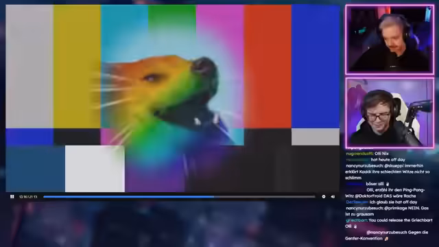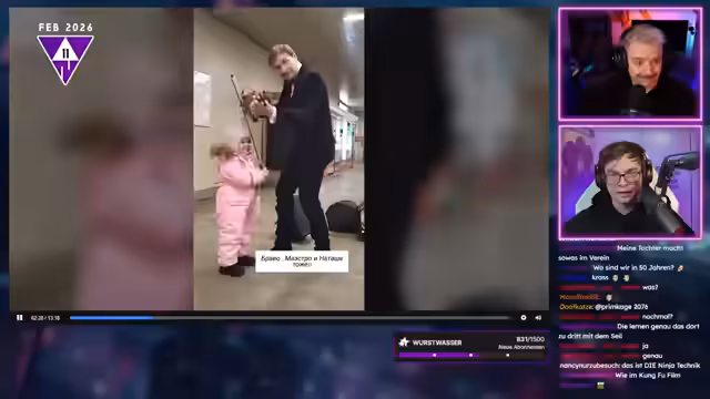 02:10:24Im weiteren Verlauf zeigt der Streamer eine Reihe von online gefundenen, kurzen und abstrusen Videos. Darunter ist eine Frau, die mit Chips und Besen Teile ihres Körcks reinigt, ein Junge, der eine Lücke in einer Tischtennisplatte nutzt, um einen Ball 'zu trinken', und ein Nashorn, das ein Spielzeugauto jagt. Der Streamer ist beeindruckt von der Kreativität und der Intelligenz, die in diesen Clips zum Ausdruck kommt. Er kommentiert die Szenen mit großer Begeisterung und verbindet sie mit dem vorherigen Thema über die cleveren Kühe, indem er spekuliert, was in 50 Jahren passiert, wenn Tiere immer schlauer werden.