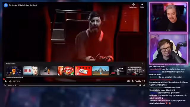 01:43:14Während der Community-Aktion werden auch andere Video-Inhalte besprochen und vorgeschlagen. Es werden Titel wie 'Perfectly Cut Screams' und 'Die dunkle Wahrheit über die Stasi' erwähnt. Der Streamer zeigt sich skeptisch gegenüber einer 'Win Compilation', da er negative Vibes von solchen Videos bekommt. Im Anschluss startet er die Wiedergabe des Videos 'Die dunkle Wahrheit über die Stasi'. Er gibt einen kurzen historischen Kontext, indem er den Geheimdienst der DDR als einen Verein beschreibt, in dem jeder ein potenzieller Staatsfeind war und das Petzen gefördert wurde.