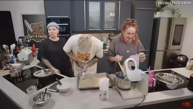 00:25:17Es werden 37 Gramm Eiweiß abgewogen und als 'feinstes Eiweiß' bezeichnet. Im Chat wird spekuliert, dass die Gruppe in der Klapse landen wird. Die Aufgabe, den Zucker zu erhitzen, wird übernommen, während Kimi sich um das Eiweiß kümmert. Die Gruppe stellt fest, dass die erste Portion Eiweiß mit einer Prise Salz steif geschlagen werden muss. Das Team kämpft mit dem Erreichen der richtigen Temperatur für den Zuckersirup (121 Grad). Es wird diskutiert, ob das Eigelb benötigt wird. Lebensmittelfarbe wird hinzugefügt, aber die Farbe wird zu dunkel, was zu Verwirrung und dem Vergleich mit Schimmel führt. Es wird versucht, die Farbe mit mehr roter Farbe zu korrigieren, aber das Ergebnis ist unbefriedigend. Die Konsistenz der Masse wird als nicht pastenartig bemängelt.