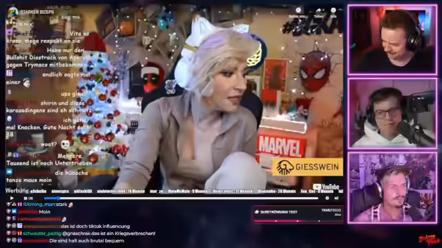 00:54:19Neben den aktuellen Inhalten werden schon Pläne für zukünftige Streams geschmiedet. Ein möglicher Termin ist die Gamescom, wo ein Arnold-Schwarzenegger-Meme nachgestellt werden könnte. Für den Mittwoch wird ein Führerscheintest mit einem Crash-Rennspiel wie Flatout ins Auge gefasst, bei dem absichtlich Parcours- Unfälle herbeigeführt werden. Auch der Wunsch, das Marvel-Rivals-Spiel zu streamen, wird in den Raum gestellt, wenn das Engagement der Community dafür vorhanden ist.