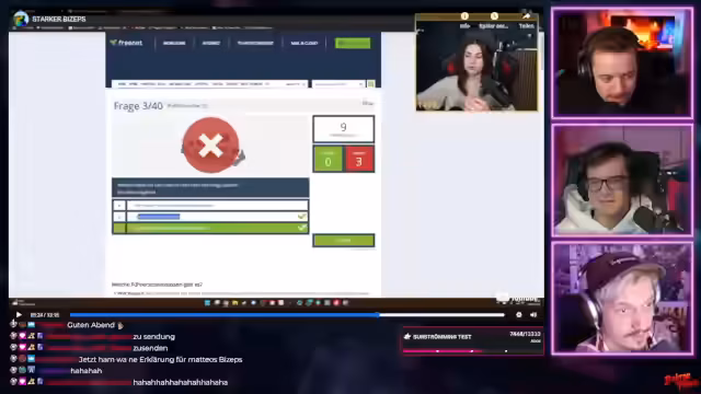 00:40:00Der Stream konzentriert sich auf die Betrachtung und Analyse von Videos auf YouTube. Der Fokus liegt dabei auf der Serie 'Guter Content, Schlechter Content', die live kommentiert wird. Die Macher reagieren humorvoll und oft kritisch auf die gezeigten Clips. Besonders ein GIF, bei dem ein Gesicht mit drei Lippen gezeigt wird, führt zu heftigen Reaktionen und Discussions über mögliche Ursachen und die KI-generierte Ästhetik der Bilder.