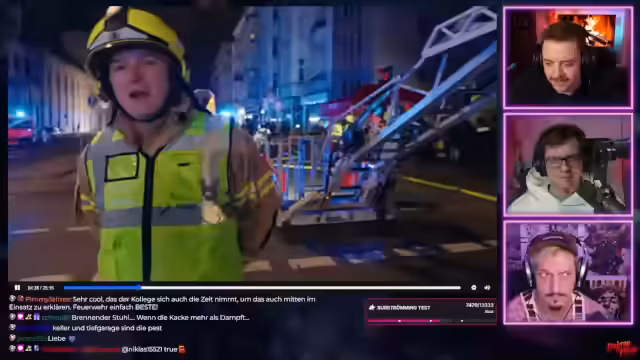 01:24:01Ein zentraler Teil des Streams bildet das Anschauen von Einsatztagebüchern der Berliner Feuerwehr. Der Fokus liegt auf einem dramatischen Kellerbrand, bei dem es zu massiver Rauchentwicklung kam und Menschen an den Fenstern in Gefahr schwebten, aus Not springen zu wollen. Die Maßnahmen der Einsatzkräfte, die schnelle Brandbekämpfung und die Personenrettung werden detailliert beschrieben und die hohen Anforderungen an die Feuerwehrmänner gelobt.