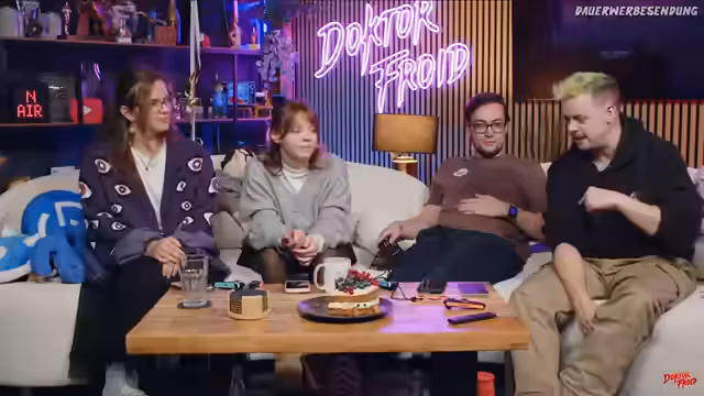 00:56:42Es wird über anstehende Inhalte gesprochen, darunter ein zweigeteilter XXL-Weihnachtskalender-Vergleich und ein Näh-Video, in dem das Team zusammen mit Farbenfuchs Hoodies näht. Gleichzeitig berichten alle vom starken Schlafmangel, der noch von den Loot-für-die-Welt-Aufnahmen herrscht. Der Streamer erwähnt, wie anstrengend die Dreharbeiten waren, insbesondere mit einer schweren Handheld-Kamera, und wie aufwändig die Nachbearbeitung war.