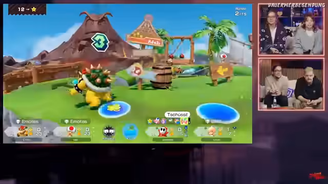01:14:37Die Teilnehmer erleben auf ihren Wegen durch das Spiel mehrfach Bowser-Felder, wo sie trotz allem nichts verlieren, da Bowser ihnen aus Mitleid Stein statt Münzen gibt. Dies führt zu strategischen Überlegungen, ob es sinnvoller ist, den direkten Weg zum Stern anzusteuern oder eine Runde im Kreis zu laufen, um Münzen zu sparen. Dabei wird das Spielbrett als unübersichtlich und teilweise verwirrend beschrieben, insbesondere im Hinblick auf Seilrutschen und die allgemeine Spielmechanik.
