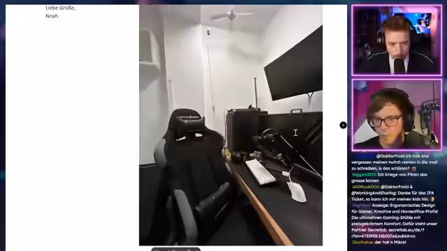 00:40:45Während einer Werbepause stellt der Streamer Secret Lab als Partner vor, insbesondere deren aktuelle Back-to-School-Aktion mit bis zu 281 Euro Rabatt. Er betont die hohe Qualität der Stühle, speziell den Warhammer 40K Ultramarines Stuhl, den er selbst verwendet, und hebt die besonderen Merkmale wie magnetisches Nackenkissen und Lordosenstütze hervor.