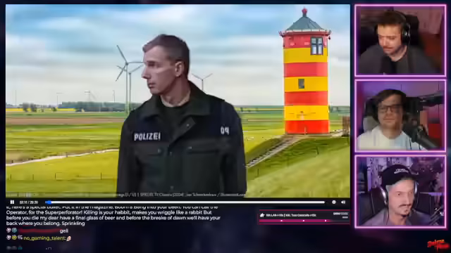 02:20:59Nach der Filmdiskussion kehren die Streamer zu einem früheren Experiment zurück. Sie interagieren mit einem mysteriösen Videoportal, das sie zu einem früheren Stream mit den Charakteren "Lord und Schlumpfi" führt. Die Unterhaltung ist surreal und beinhaltet skurrile Entscheidungen zwischen roten und blauen Taler sowie humorvolle und absurde Kommentare. Anschließend wird das neu entdeckte Spiegel-TV-Archiv "Ostfriesland ist ein Fiebertraum" vorgestellt, eine True-Crime-Serie aus dem Jahr 2001, die im Stream angesehen wird.