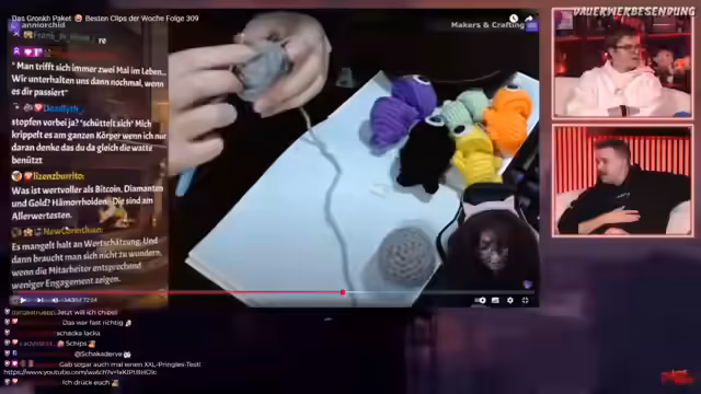01:51:50Im Segment 'Gronkh-Paket' analysieren die Streamer verschiedene Twitch-Clips aus der vergangenen Woche. Besonders eine Szene, die ein Tagebuch mit einem Fluch aus dem Jahr 1925 zeigt, führt zu einer intensiven Diskussion über Authentizität und Gruselfaktor im Vergleich zu heutigen Memes. Die Streamer unterhalten sich über historische Verschwörungstheorien, Hexenverbrennungen und ihre eigenen Reisen. Die Chat-Interaktion ist hoch, wobei die Clips von den Zuschauern live kommentiert und analysiert werden. Der Fokus liegt auf humorvollen und oft absurden Inhalten, die im Streamer-Milieu entstehen.