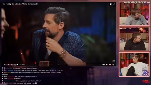 01:32:33Holi wird als Partner erwähnt, der leckere Sorten anbietet. Es wird eine Anekdote über die Verwendung von Sägespänen in Abwasserkanälen erzählt. Ein Zuschauer fragt, wer den stärksten Alkohol Deutschlands verträgt. Es wird auf die legendäre Elefantenrunde im ZDF vom 18. September 2005 verwiesen und gefragt, wer daran teilgenommen hat. Es wird über die Anzahl der Teilnehmer und die Zusammensetzung der Runde spekuliert. Das Spielprinzip des Quizpokers wird erklärt, und es wird über die Fairness der Moderatorin diskutiert. Es wird erwähnt, dass Gerhard Schröder und Angela Merkel an der Elefantenrunde teilgenommen haben.