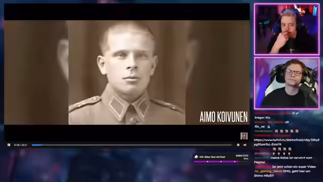 01:25:01Der Stream startete eine neue Reaktion auf ein Video über einen finnischen Soldaten namens Aimo. Hintergrund war der Fortsetzungskrieg Finnlands gegen die Sowjetunion. Aimo, Mitglied eines Aufklärungstrupps, erhielt den Auftrag, verdächtige Aktivitäten in einem Sektor zu untersuchen, nachdem sein Aufklärungsflugzeug sie entdeckt hatte. Die Operation verlief jedoch unauffällig, was zu einer gefährlichen Situation führte.