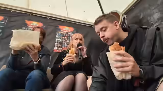 03:50:36Das Team führt die Zuschauer durch den exklusiven Wacken United Bereich. Zuerst wird das Pressezelt mit Live-Übertragungen besucht. Anschließend wird der Eingang zur Artist Area gezeigt, wo Stars wie Axl Rose als Attraktion fungieren. Ein offizieller Merchandise-Stand und eine Falafel-Bar werden ebenfalls vorgestellt.