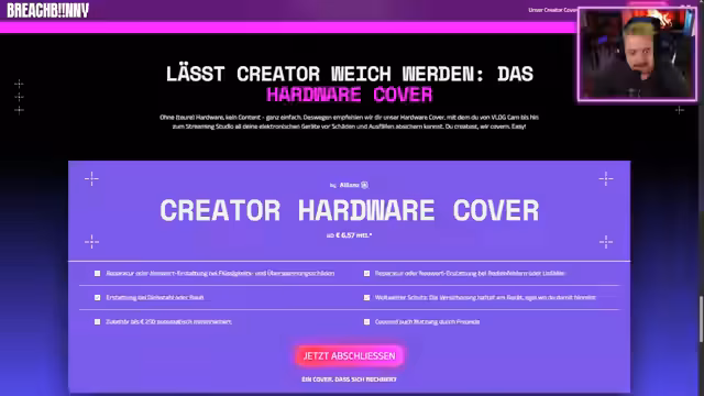 00:47:32Paul kündigt seine Ankunft in etwa einer halben Stunde an und bittet den Streamer, Breach Bunny vorzustellen. Breach Bunny wird als ein innovatives Projekt der Allianz beschrieben, das speziell auf junge Leute und Gamer zugeschnitten ist. Die Plattform bietet Versicherungen für moderne Bedürfnisse an, die traditionelle Versicherungen oft nicht abdecken. Beispiele hierfür sind Hardware-Cover für PCs, Capture Cards und Konsolen, Haustierversicherungen für tierärztliche Versorgung sowie ein 'Mein Schatz'-Cover für individuelle Wertgegenstände. Besonders hervorgehoben wird der Support, der über bekannte Plattformen wie Discord und WhatsApp erreichbar ist und auf Augenhöhe kommuniziert. Weitere Angebote umfassen Creator-Cover (Datenschutz, Cybermobbing, Urheberrechtsschutz, Forderungsausfallschutz, psychologischer Support) und Virtual-Cover (Schutz vor Hacking, Mobbing, Doxing, Social Engineering, ID-Überwachung und E-Reputation-Wiederherstellung). Der Streamer empfiehlt Breach Bunny wärmstens, da es ein langweiliges Thema wie Versicherungen modern und zugänglich macht und auf die spezifischen Probleme der Zielgruppe eingeht.