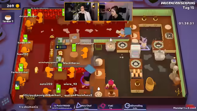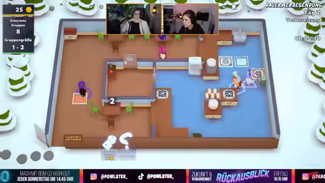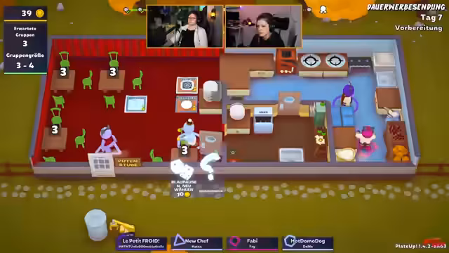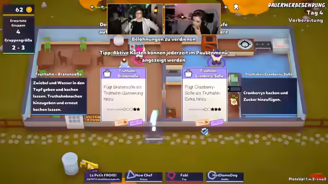 05:14:49Der Stream konzentriert sich auf die Organisation und das Abarbeiten von Bestellungen in einem kooperativen Spielszenario. Es werden Bestellungen angenommen, Gerichte wie Zwiebeln, Cranberry-Soße, Fleischbällchen und Klösschen zubereitet und serviert. Die Koordination der Abläufe zwischen den Teilnehmern ist zentral, wobei die räumliche Anordnung der Tische und Kochstellen oft als unvorteilhaft beschrieben wird. Es werden verschiedene Strategien zur Bewältigung der ansteigenden Komplexität diskutiert, wie zum Beispiel die Anschaffung zusätzlicher Arbeitsflächen.