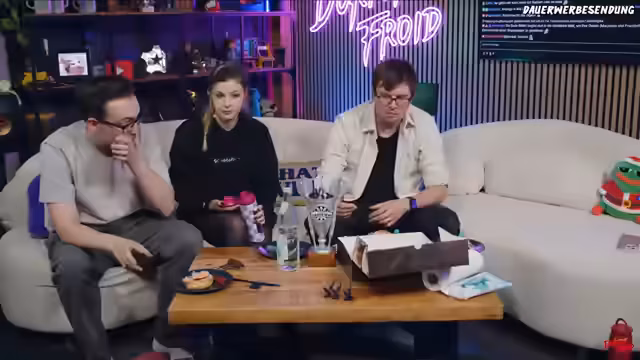 01:30:50Die Streamer planen den Aufbau und ihre Rollen für den Stream. Nachdem sie über die Essenssituation diskutiert haben, wechselt Kata ihren Stuhl gegen einen bequemen Stuhl von Secret Lab. Dies führt zu einer Partnerankündigung, bei der der Kanal Secret Lab für hochwertige Gaming-Stühle, höhenverstellbare Tische und weitere Produkte bewirbt. Gemeinsam entscheiden sie sich, die Kameras während des Essens gegenseitig aufeinander zu schalten, um dem Publikum Entertainment zu bieten.