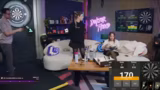 06:27:07Um den Hype Train Level 10 zu erreichen, wurde ein besonderes Dart-Spiel ausgemacht: Das Spiel beginnt erst, wenn Katja ein Bullseye wirft, alternativ könnte ein Century Black geworfen werden oder es wird eine Double Out-Regel angewendet. Währenddessen versuchte Paul, gute Würfe zu landen, während die Gemeinschaft versuchte, das Ziel zu erreichen. Nachdem das Level 10 erreicht wurde, wurde die Regel verfeinert, sodass derjenige, der dem Bullseye am nächsten kommt, das Spiel beginnen darf.