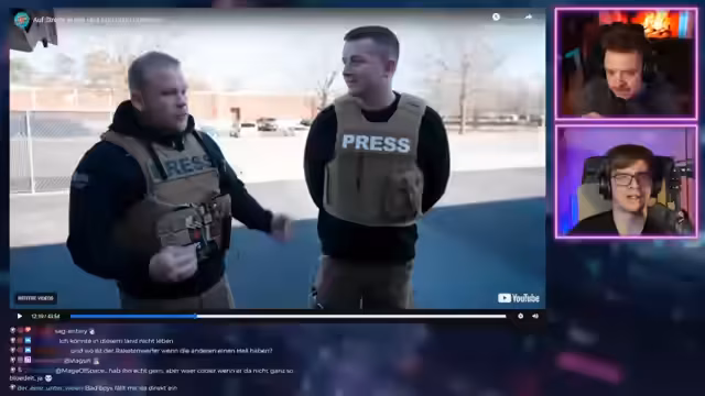 00:59:14Der Streamer und sein Co-Host schauen und kommentieren verschiedene YouTube-Videos. Zuerst wird ein Unusual Memes-Clip mit einem Quad-Unfall analysiert, der als gefährlich eingestuft wird. Danach folgt ein 'Daily Dose' Clip über einen Flugzeugnotfall mit Fallschirm. Der Hauptfokus liegt auf dem Video 'Streife in den USA' von First Responders, in dem ein Praktikant die Arbeit der Polizei in Alabama begleitet und deren Ausrüstung, darunter schwer gepanzerte Fahrzeuge und ein Vietnamkrieg-Hubschrauber, vorgestellt wird.