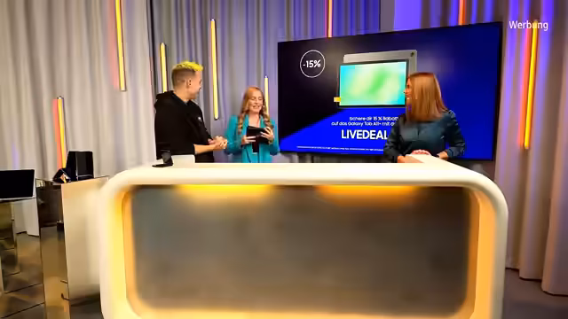 01:08:01Im Chat wird eine schnelle Umfrage gestartet, um zu ermitteln, wer das 'The Great Rematch' gewinnen wird – Phoebe oder Knossi. Phoebe liegt dabei deutlich vorne, sowohl in der Live-Umfrage im Chat als auch in einer Umfrage auf der Samsung-Website. Anschließend wird der Triple Laser Projektor 'The Premiere 5' vorgestellt, der auf der IFA getestet wurde. Er beeindruckt durch seine Fähigkeit, Bilder bis zu 100 Zoll Größe aus nächster Nähe an Wände zu projizieren und interaktive Funktionen wie Touch-Steuerung zu ermöglichen, wenn er auf Oberflächen projiziert wird. Die vielseitigen Einsatzmöglichkeiten, wie zum Beispiel für Workouts, werden dabei besonders hervorgehoben.