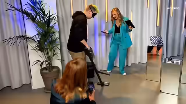 00:40:08Olli nimmt an der 'Staubsauger-Challenge' teil, bei der ihm die Augen verbunden werden und Alexia ihn durch einen Parcours mit Schmutz führen muss, den er blind aufsaugen soll. Die Community wird aufgefordert, weiterhin fleißig zu kommentieren, da nach der Challenge der erste Sieger bekannt gegeben wird. Olli erhält den Jet 85 und muss intuitiv die Tasten finden und das Gerät bedienen. Er navigiert geschickt durch den Parcours und saugt den Schmutz auf, wobei Alexia ihm Anweisungen gibt. Die Zuschauer im Chat loben seine Fähigkeiten als 'perfekter Hausmann'. Später wird ein kleinerer Aufsatz für Ritzen und schwer zugängliche Stellen verwendet. Die wechselbaren Akkus des Jet 85, die eine Laufzeit von bis zu 120 Minuten ermöglichen, werden ebenfalls hervorgehoben. Die Challenge wird fortgesetzt, wobei Olli verschiedene Aufsätze testet und den Schmutz aufsaugt, während die Community gespannt das Geschehen verfolgt und weiterhin fleißig kommentiert.